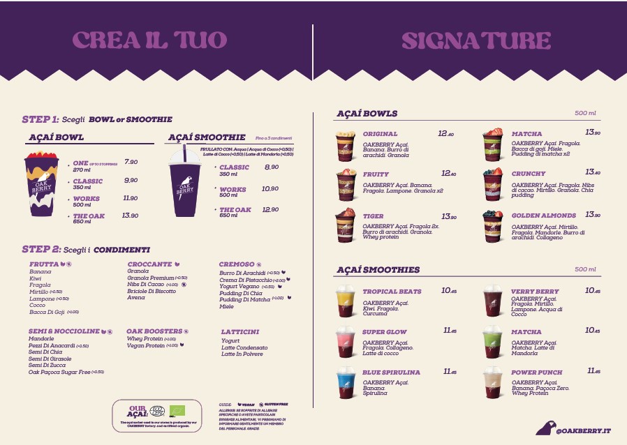 For those craving customization, the Smoothies - Crea Il Tuo options allow you to build your own blend, adding unique toppings to suit your taste. Don't miss the delectable Sfiziosità, such as the protein-packed OAKbars, perfect for a quick snack.